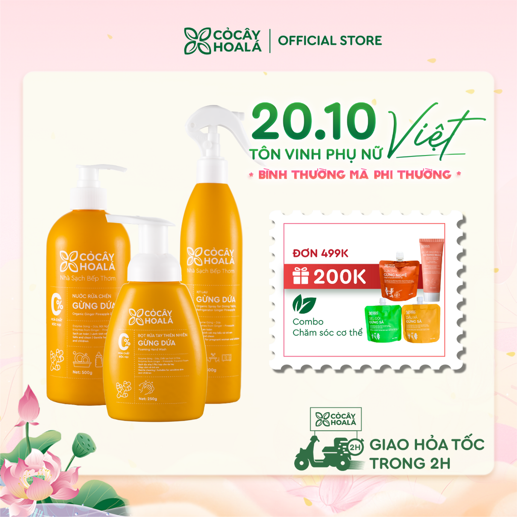 Combo Nhà sạch Bếp thơm gồm 3 sản phẩm: Bọt rửa tay, Nước rửa chén, và Xịt lau đa năng Gừng Dứa, được thiết kế để đồng hành cùng các gia đình trong việc giữ gìn không gian sống sạch sẽ – an toàn – dịu nhẹ với da tay. Với công thức enzyme Gừng & Dứa lên men tự nhiên, kết hợp chất làm sạch có nguồn gốc thực vật, bộ sản phẩm hỗ trợ làm sạch hiệu quả dầu mỡ, bụi bẩn và vi khuẩn – mà vẫn thân thiện với da tay nhạy cảm, không để lại dư lượng hóa chất hay mùi hắc khó chịu trong quá trình sử dụng.